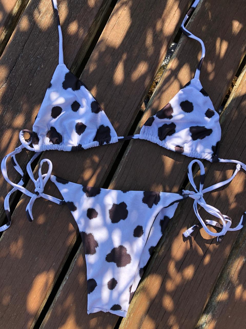 Top cortininha, alça de amarrar e bojo removível, calcinha de amarrar, fio duplo.